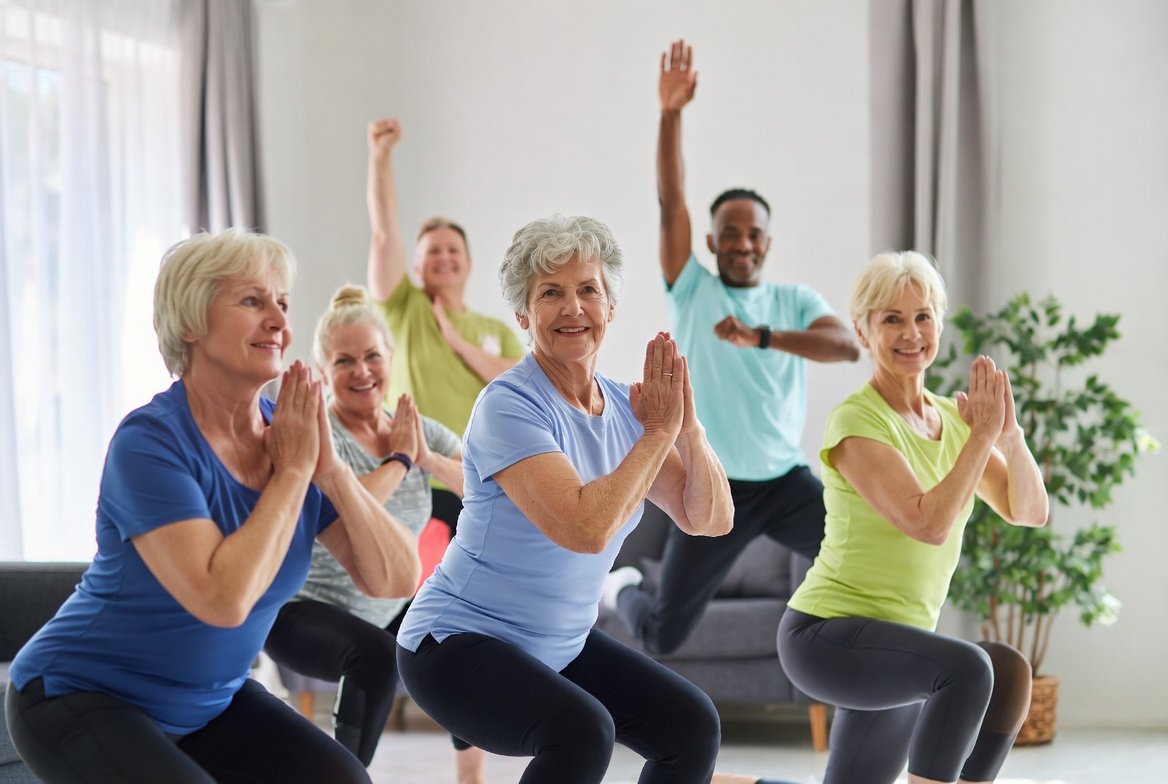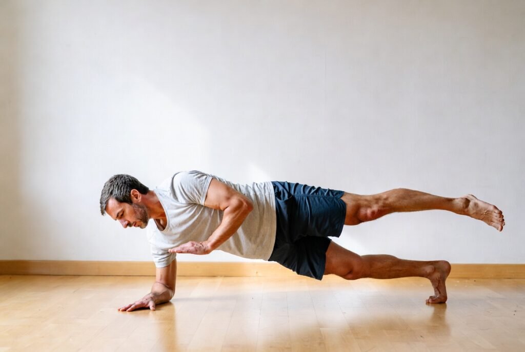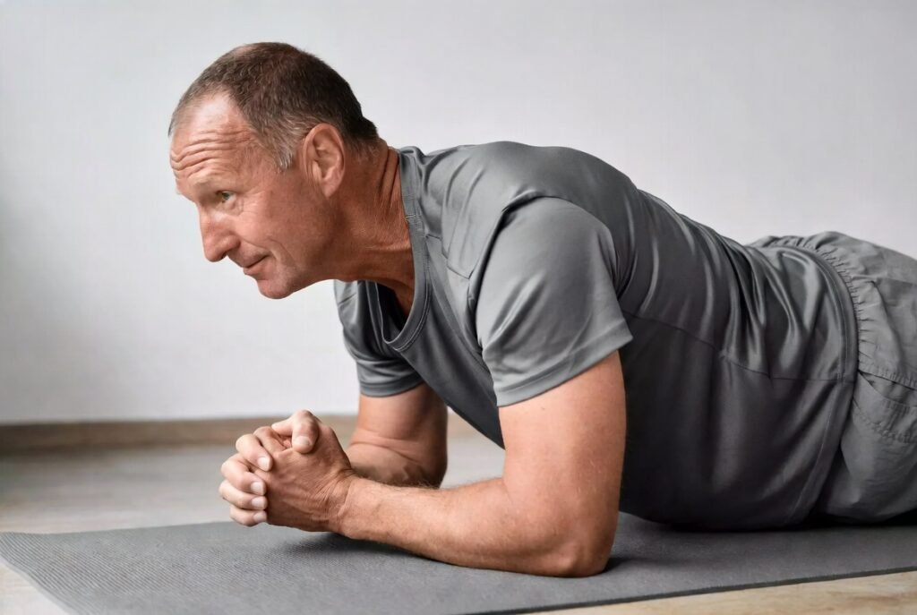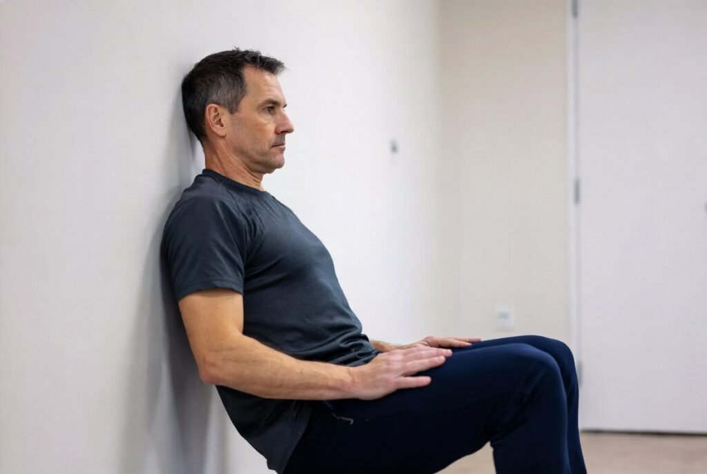 Back against the wall, slide down to thighs parallel with the floor, hold like sitting in an invisible chair. Builds leg endurance and knee stability without impact. Great for longer walks or standing tasks. Start 20 seconds.