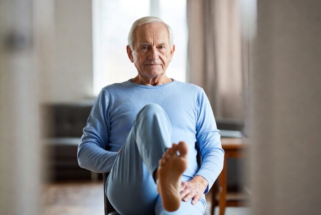 Sit tall in a chair, alternate lifting knees toward your chest like marching. Engages core gently, improves hip flexors and posture. Easy on joints, perfect for desk breaks or TV time. 15-20 marches.