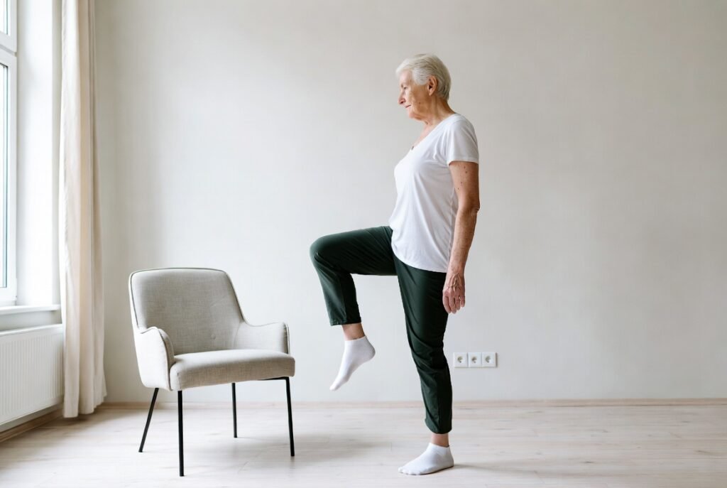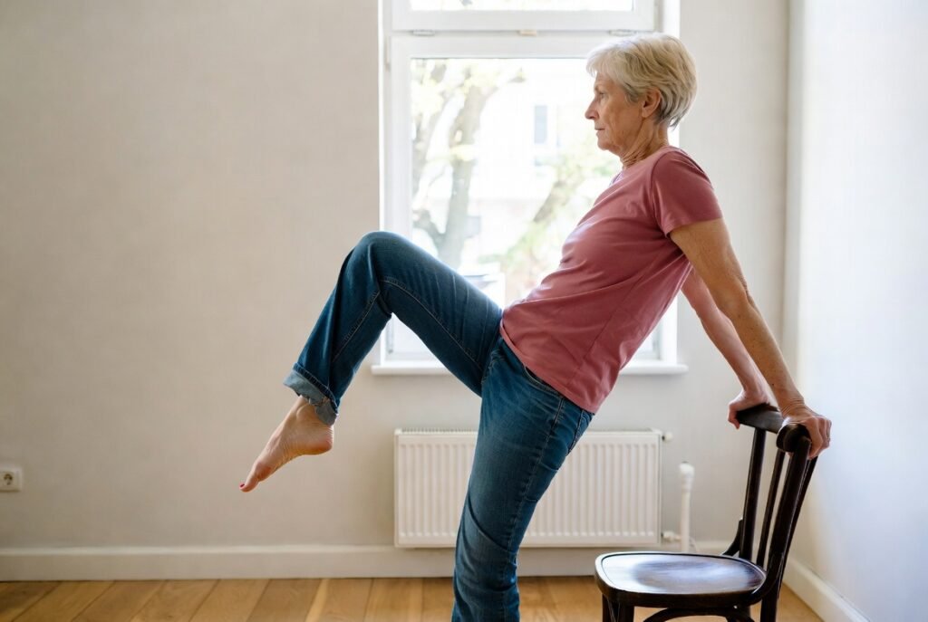 Stand tall, lift one foot slightly off ground, hold steady (use a chair for support if needed). Switches sides. Builds balance to prevent falls, strengthens ankles, and the core. Many find that daily practice sharpens steadiness fast. Hold 20-30 seconds each.