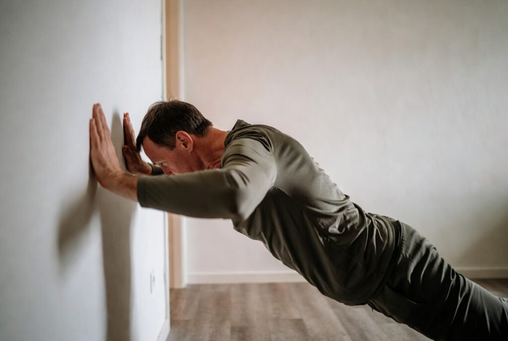 Face a wall with your hands and shoulder-width apart, slowly bend over your elbows to lean in, then push back. This exercise is easier than the floor ones and helps to build the chest, shoulders, and arms gently. This is good for supporting posture and upper body tasks like carrying groceries.