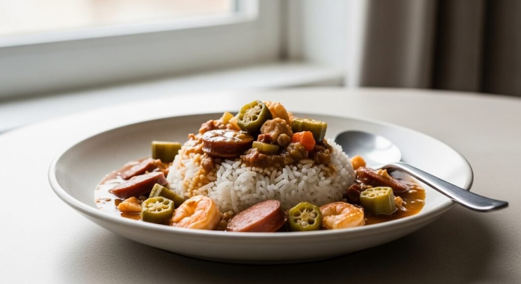 A bowl filled with okra, swimming in a dark roux-based sauce, shaped by Louisiana’s layered roots. Seafood slips between chunks of sausage or chicken, all nudged by the warmth of a spicy broth. This dish grows not just from ingredients but from African cooking methods meeting French technique amid Spanish flair and Native survival stories.