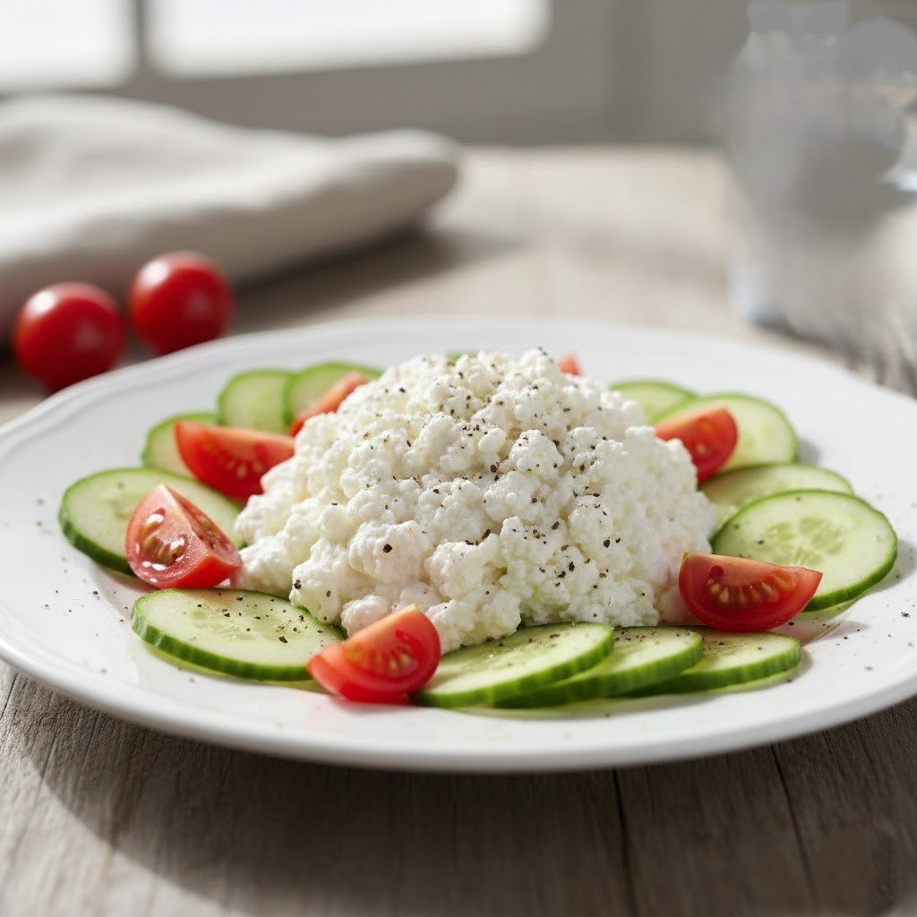 Cucumber, tomatoes and pepper on cottage cheese provide low calories of lean protein. It is a cool one, simple to make, and it keeps the hunger at bay.