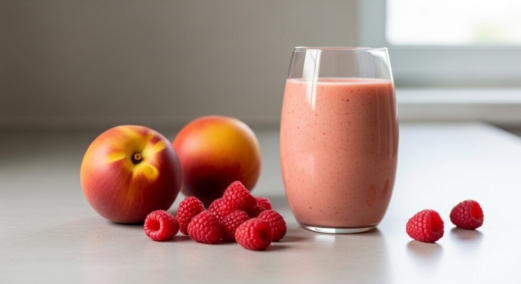 Fiber fills raspberries, leaving you feeling more satisfied. Because of the peach, the blend stays balanced – not too sweet, never too thick. Satisfaction comes naturally here, no extra sugar needed, just real flavor.