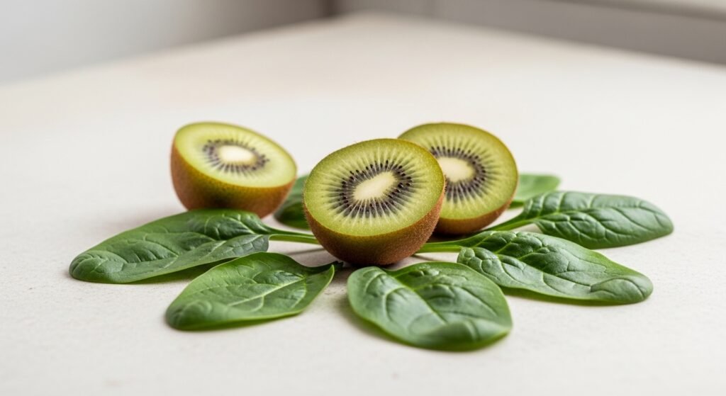 Fiber and digestive enzymes come from Kiwi. Spinach brings nutrients – no added calories. This mix tastes light but leaves me satisfied, keeping energy steady and hunger lower as hours pass.