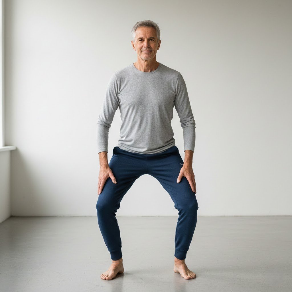 Squats involving the use of bodyweight support the thighs, hips, and glutes and reinforce the correct patterns of movement applied in sitting down or standing up. Doing them where they are comfortable to the knees serves as a precaution to the knees and keeps up muscle bulk.