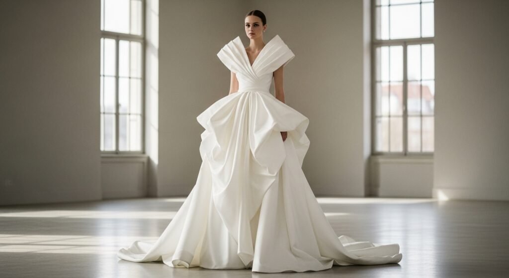 Folds drifting through air, gentle shapes, tiny touches brought back dreamy gowns for brides. This piece brought feeling back to weddings – designs now flow with ease, shaped by motion, quiet grace.
