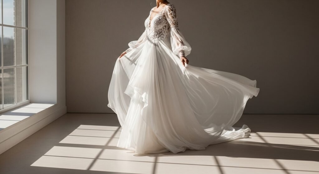 Folds that once hid now drew eyes. With every step, silence spoke louder than sound. This garment proved soft ideas might still shine bright, sharp, and full of character – turning wedding views sideways.