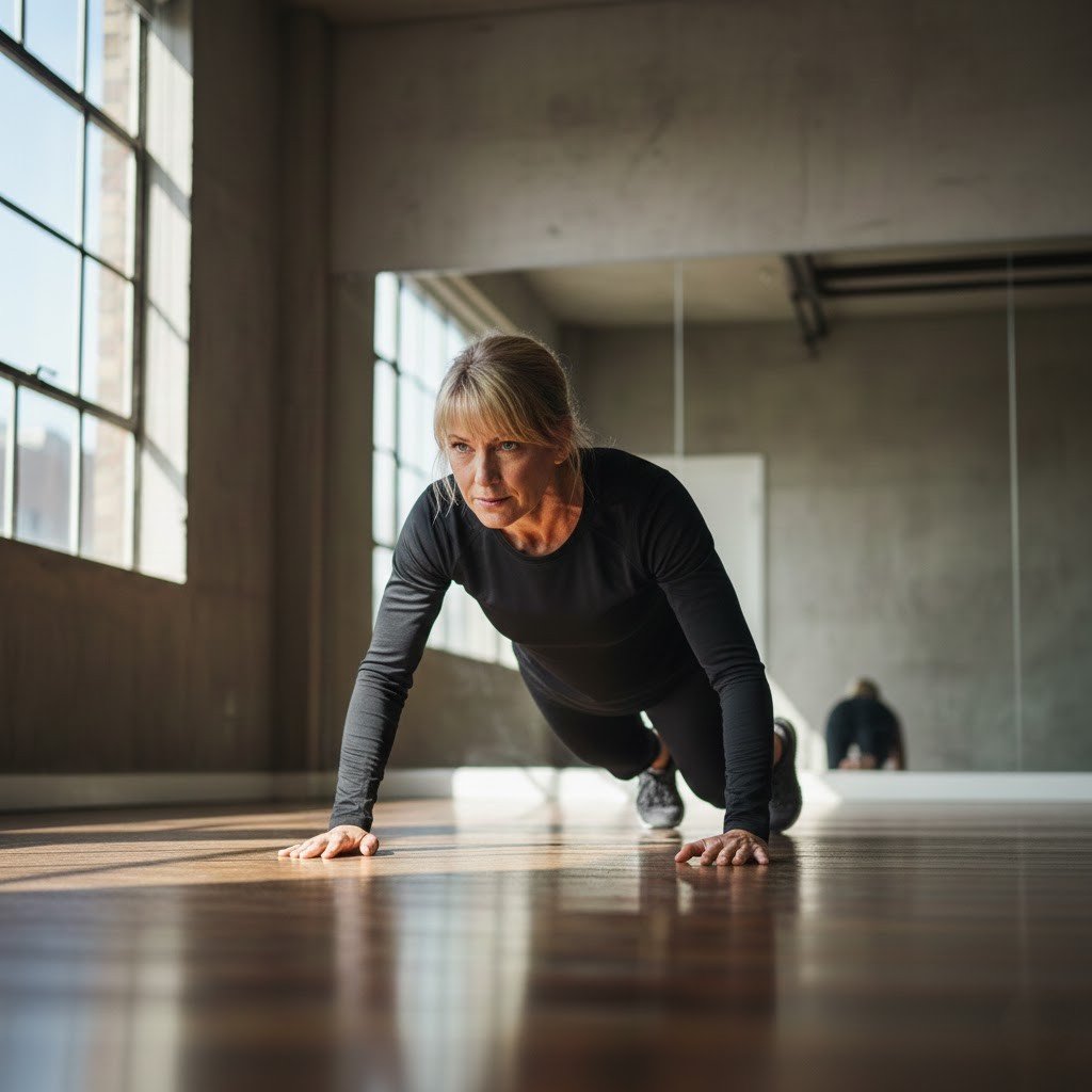 If full ones are hard, start on knees or hands on a counter, lower down slowly, and push back up. Keep the body straight. Hits chest, shoulders, arms, and core together, which is more useful than bench presses for pushing doors, getting off the ground, or just holding good posture all day.
