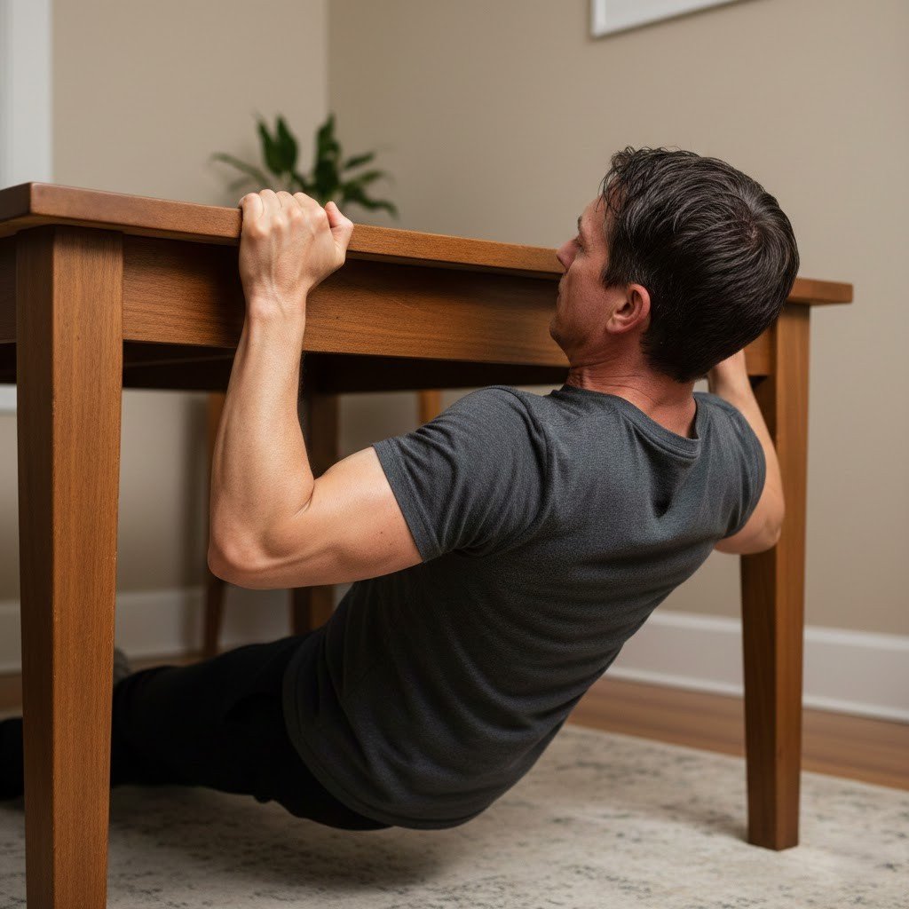 Use a sturdy table edge or low bar: lie under, grip, pull chest toward it while keeping body straight. No bar? Do door rows with a towel. This pulling move strengthens back, shoulders, and posture muscles that weights often neglect, countering desk hunch and keeping shoulders healthy for reaching or lifting overhead.