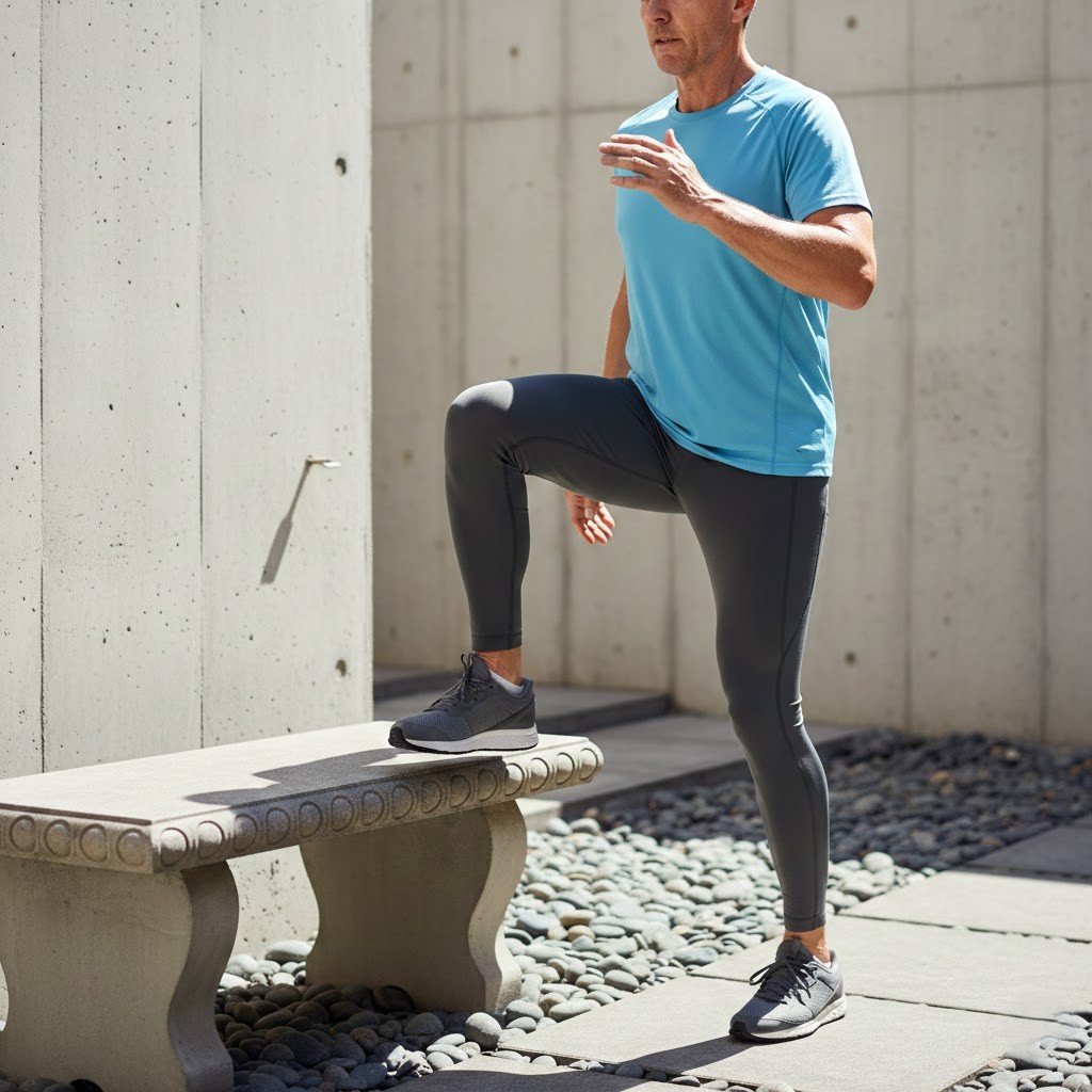 Use a sturdy bench, stair, or low chair, step up with one foot, drive through heel, bring the other knee up, step down controlled. Alternate legs. This exercise mimics climbing the stairs or getting out of deep chairs, builds quads and glutes without the impact of running.