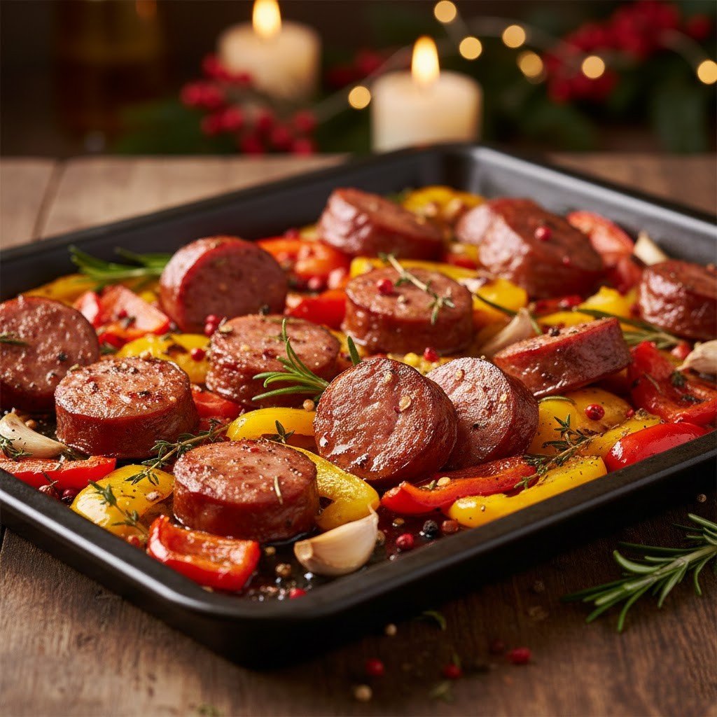 Slice link and bell peppers, muzzle with olive oil and rally everything together in a pan. The oven brings out the best flavour when perfectly tossed with some seasonings.
