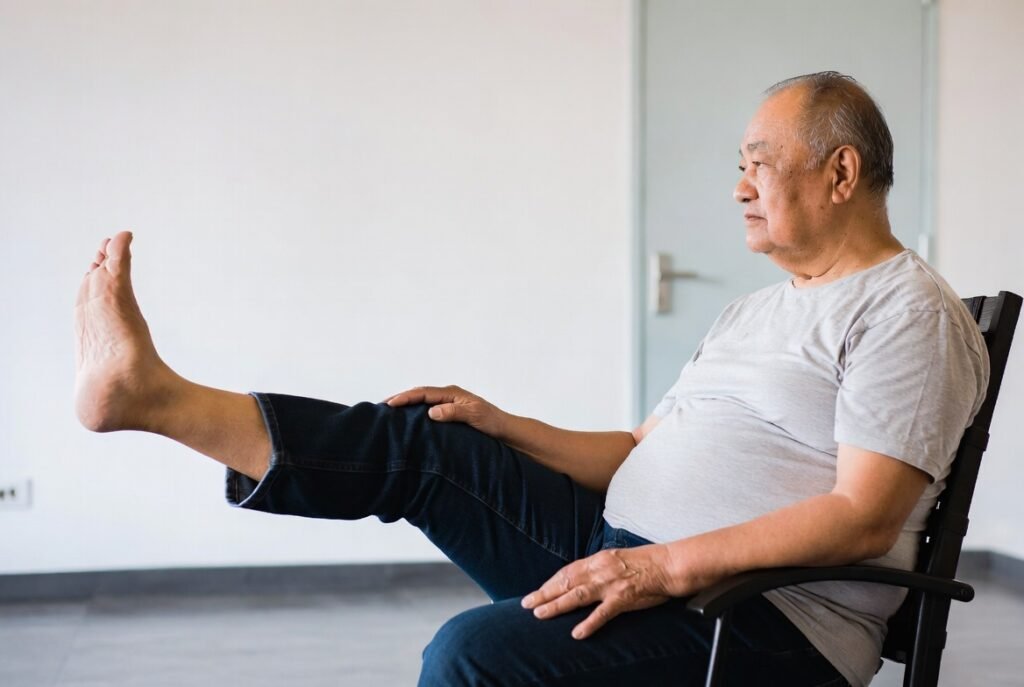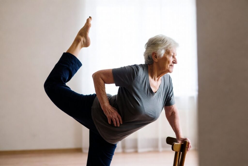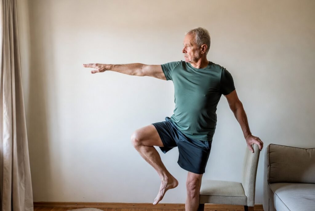 Stability enhancement to avoid falling; support yourself on a chair or counter, and slightly raise one foot above the ground, keep it for 10-30 seconds on each side. Do it 3-5 times more. The balance training in this form is very beneficial for older people, as it dramatically lowers the risk of falling when done regularly.