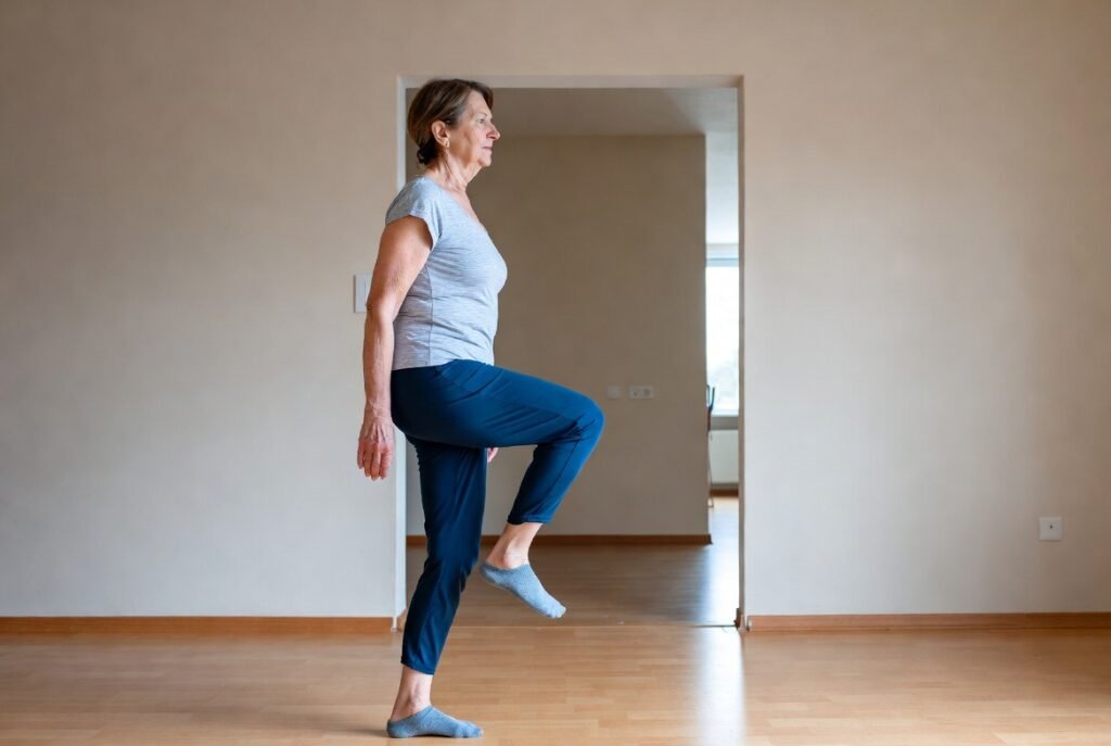 One can hold a chair while doing this exercise for balance. Slowly getting up on the toes, staying there for one second, and then going down again is what the exercise consists of. The exercise is basic, yet powerful for foot and lower leg strengthening, which in turn is beneficial for balance and reducing stumble risks.