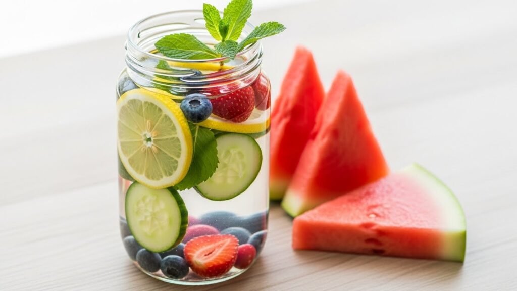 Not just plain water, but also lemon, cucumber, mint, or berries can be added to it for extra antioxidants and flavor which will make you drink more. Consume water-rich foods like watermelon or celery along with drinking water to get hydrated in a natural way.