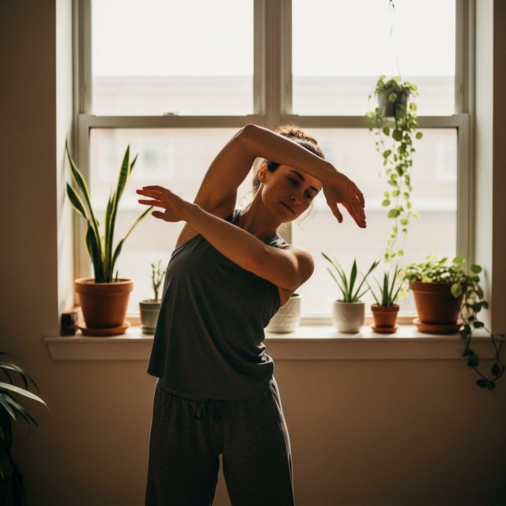 Shoulders and upper back can be moved through slow arm movements. This can assist in relieving the tightness and leaving the arms feeling light, particularly on the days when the majority of activities are done at a desk or on a phone.
