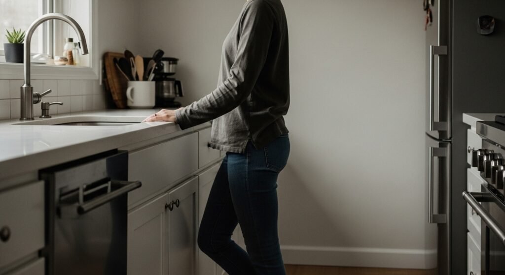 Balance practice may be made natural by using a kitchen counter to support light. Morning routine tends to occur here, and so low-level exercises can be easily incorporated into the existing environment without significant planning and effort.