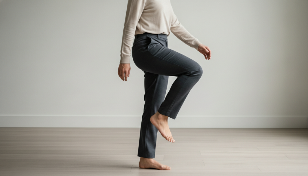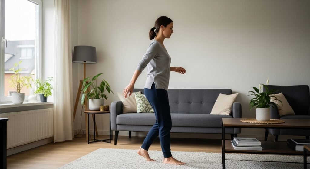 Rhythmic balance practice can be provided by slow and controlled marching in place. Knee lifting can be used to assist in coordination with every knee raised individually, and the body can resume familiar walking patterns before the day gets hectic.