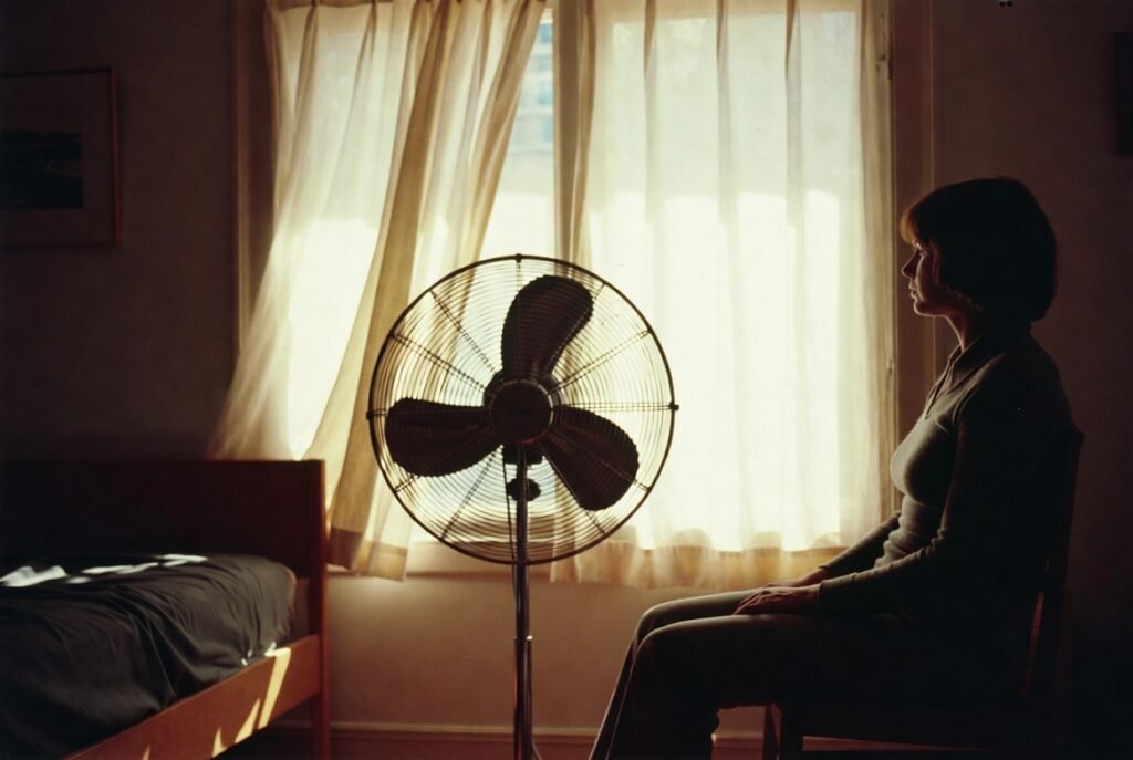 During hot seasons, rooms were cooled with large floor fans. Their constant buzzing and the spinning blades that were visible were part of the house ambiance even before the introduction of central cooling systems.