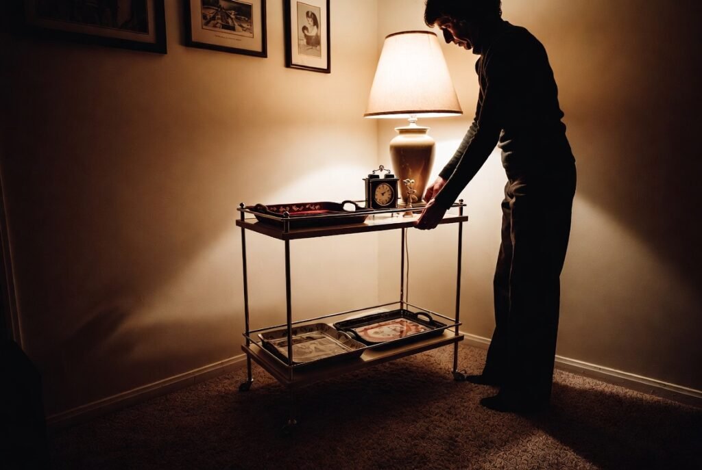 Many living rooms or dining areas had bar carts. They could be very decorative and practical as well as not frequently used, but they could represent entertaining styles of the time.