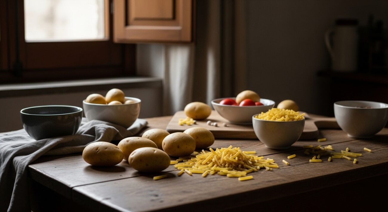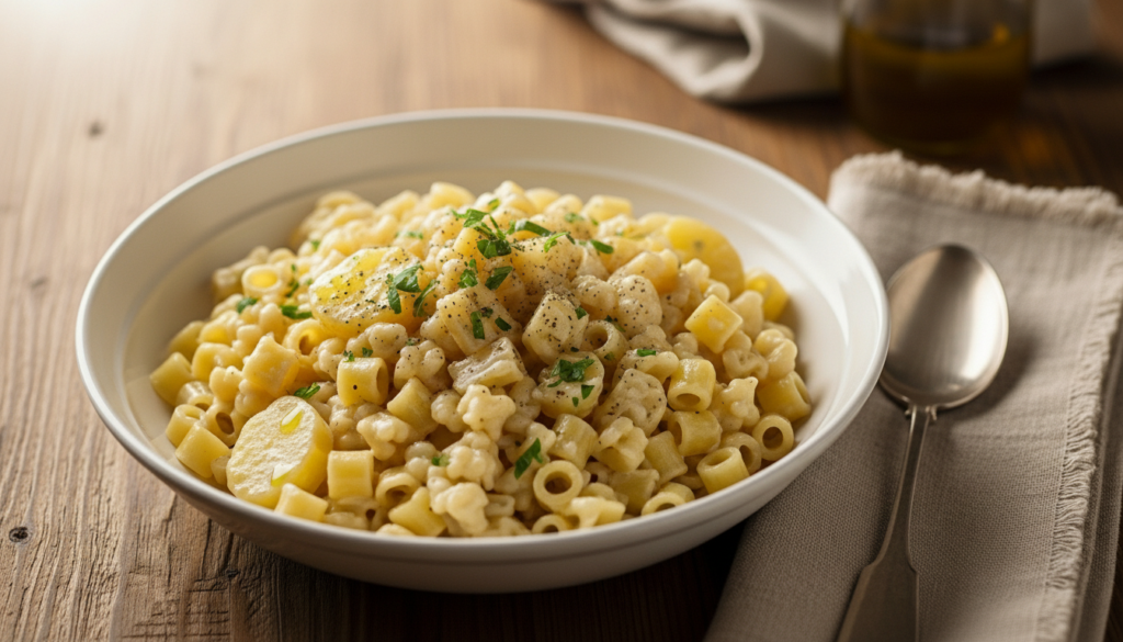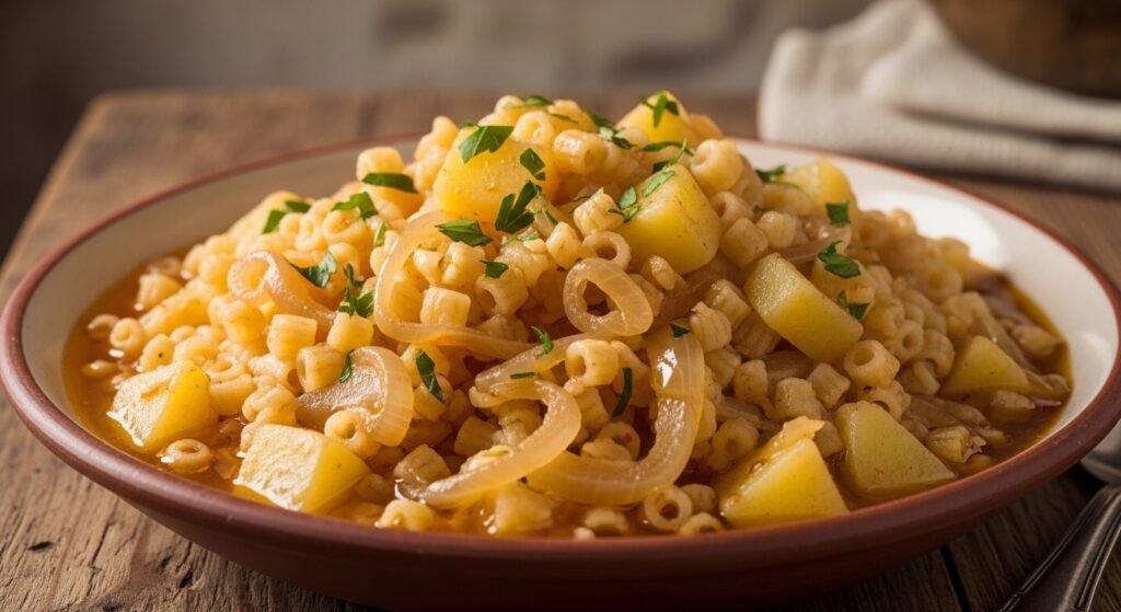 Potatoes show up first in traditional pasta e patate, along with short-shaped noodles, onion, olive oil, water, salt. Not every version carries that note; plenty stay clear of animal pieces altogether. Then there’s the tomato paste, sometimes mixed in, sometimes left behind like a quiet debate across kitchens.