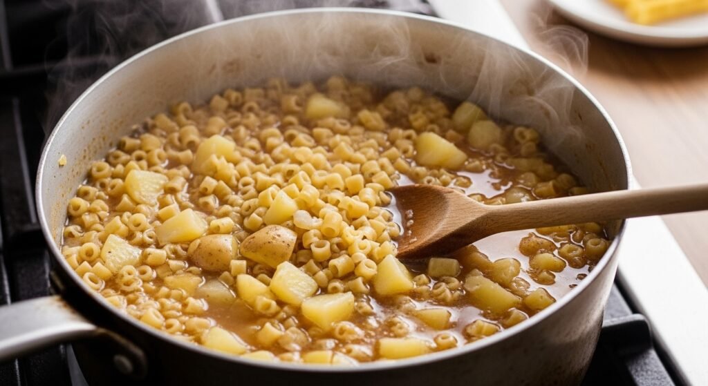 What sets it apart? Here, the pasta cooks within the very pot holding the potatoes, no extra vessel needed. Long coils give way to small forms – ditalini, tubetti, or sliced spaghetti pieces – slipping directly into the simmering spud broth. Heat changes the pasta and potato. Blending or mixing with milk isn’t required here.