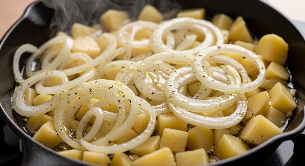 Fragrant onion slices lose firmness as golden droplets of olive oil rise to meet them, transforming into softness without burning depth. Heat lingers low, skipping the crisp edge that flame often brings. Before long, chunks of potato slip into view – chopped fine, drinking in scent and steam much like quiet listeners absorb stories.