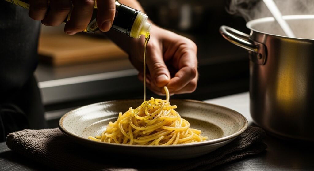 When the pasta feels done yet still has bite, it comes out of the pot. A splash of olive oil goes in next, possibly a pinch of pepper underneath. Some people cover it briefly – just sixty seconds or so – letting each layer settle into its own sauce.
