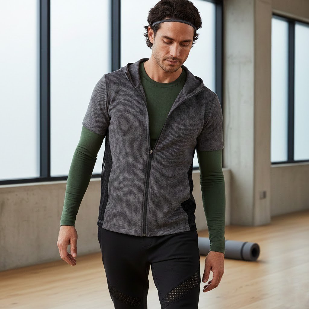 The year 2026 will see warm-up layers that are not only less heavy but also more purpose-built, light insulation, featuring breathable panels, and fabric that can easily transition from the studio to the street without the need for outfit change. Activewear trend reporting continues to focus on ventilation strategies such as mesh placement and adaptable fabric choices, which is in line with the actual dressing habits of men for yoga layer up to arrive, move comfortably, and leave without any trouble.