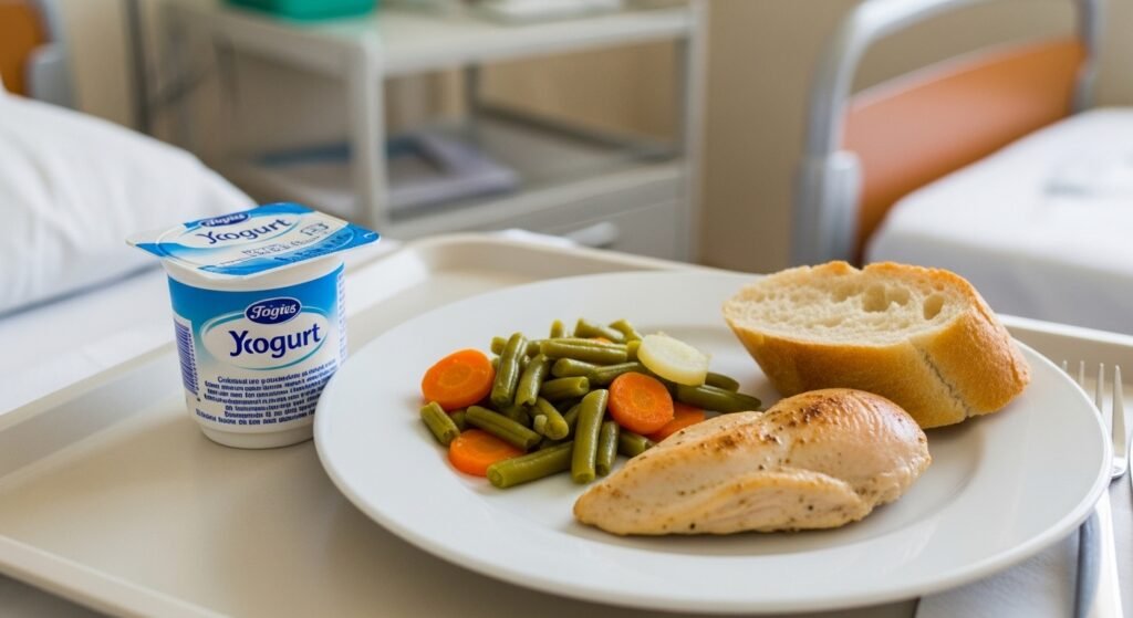 In France, hospital meals often resemble simplified home cooking. Patients may receive vegetables, protein like chicken or fish, yogurt, and sometimes bread. While not gourmet, the food reflects France’s emphasis on balanced meals and eating at set times.