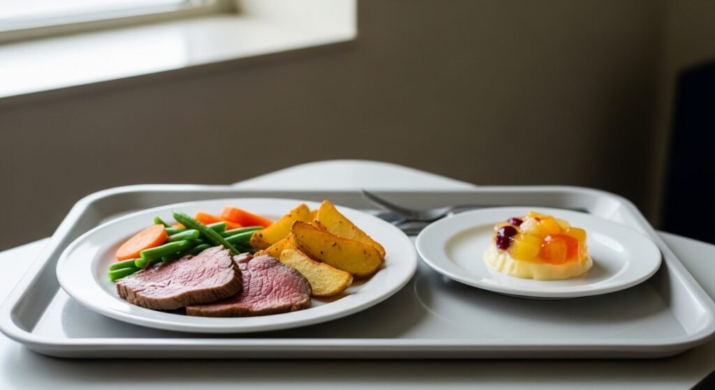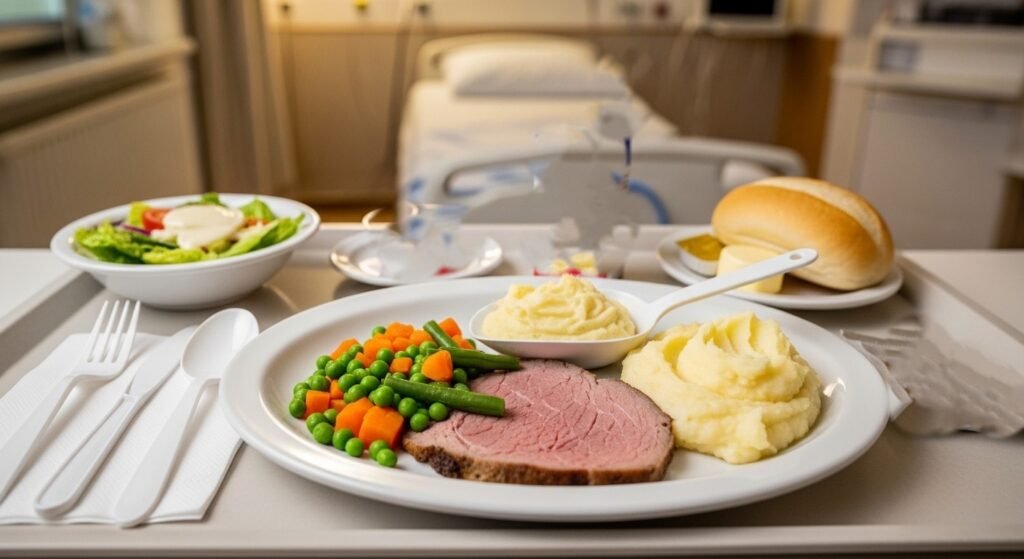 UK hospital food usually includes simple hot meals such as meat with vegetables, soups, or casseroles. While basic, there is increasing focus on patient choice, dietary needs, and improved nutritional balance.