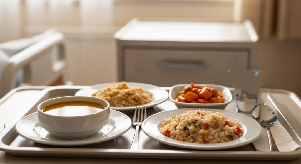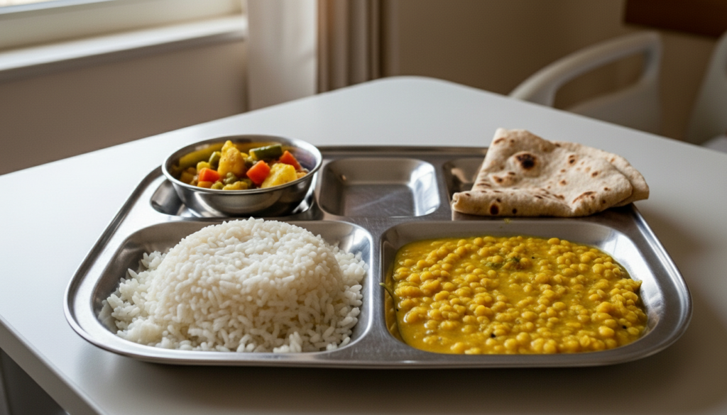 In India, hospital food varies by region but often includes rice or flatbread, lentils, vegetables, and mild spices. Meals are typically vegetarian-friendly and designed to be gentle on digestion while still nourishing.