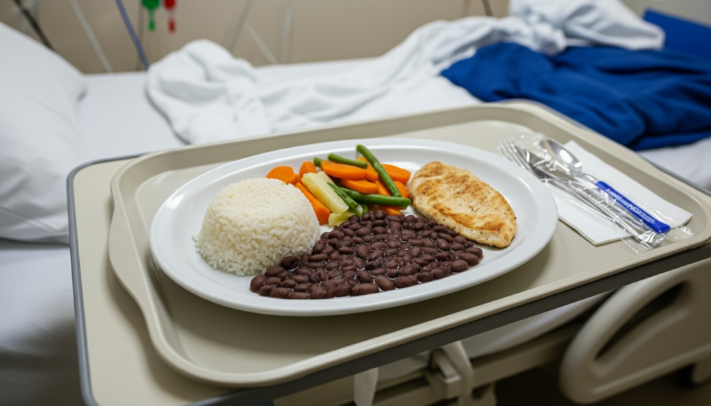 Brazilian hospital food often includes rice, beans, vegetables, and protein like chicken or fish. Meals are simple, filling, and familiar, reflecting everyday Brazilian home cooking rather than special dietary trends.