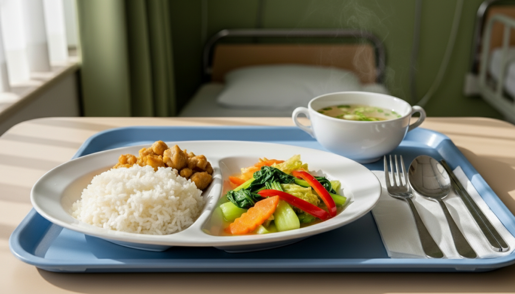 Chinese hospital meals vary by region but often include rice or noodles, vegetables, soup, and small portions of protein. Food is seen as part of healing, with meals designed to restore balance in the body.