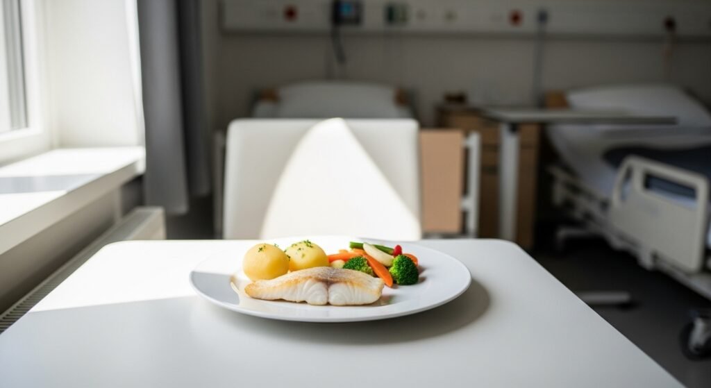 Swedish hospitals emphasize nutrition and simplicity. Meals may include fish, potatoes, vegetables, and dairy. There is a strong focus on balanced diets, clean flavors, and supporting overall recovery.
