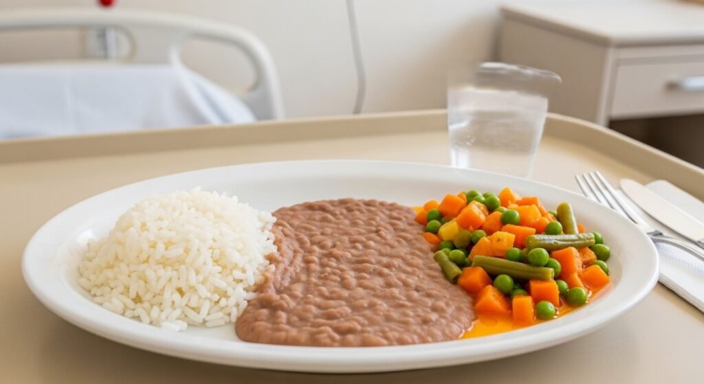 Hospital food in Mexico often features rice, beans, mild sauces, and vegetables. Spices are toned down, but the meals still reflect traditional Mexican flavors in a gentler form suitable for patients.