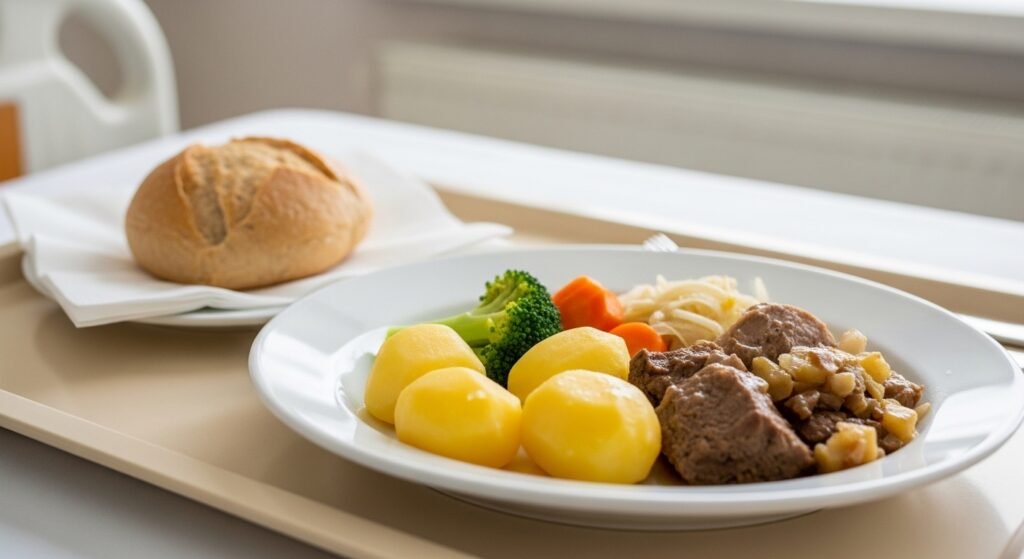 German hospital food tends to be hearty and practical. Meals often include bread, potatoes, meat or fish, vegetables, and dairy. Portions are filling, designed to maintain strength rather than impress visually.