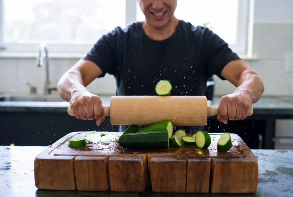 Instead of slicing, you smash the cucumber with the flat side of a knife, rolling pin, or meat mallet. It cracks open into jagged pieces that hold way more dressing. This quick step gives insane texture: crisp yet craggy, way better than plain slices