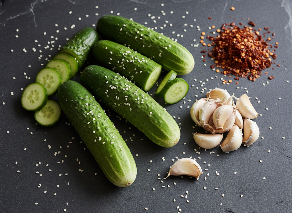 Get 1-2 English or Persian cucumbers, rice vinegar, soy sauce, a handful of garlic cloves, sesame oil, a pinch of salt, and chili flakes or oil for heat. You can also add optional extras like green onions, cilantro, or sesame seeds to take it over the top. No fancy pantry raid needed!