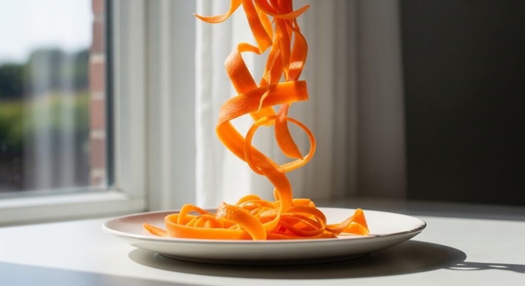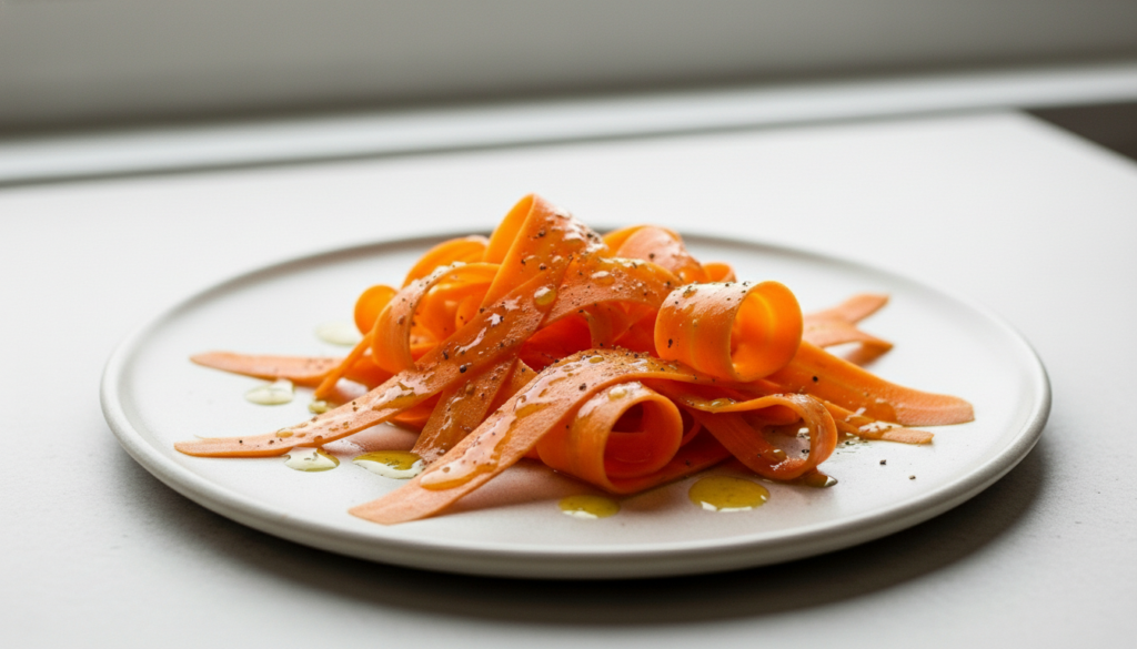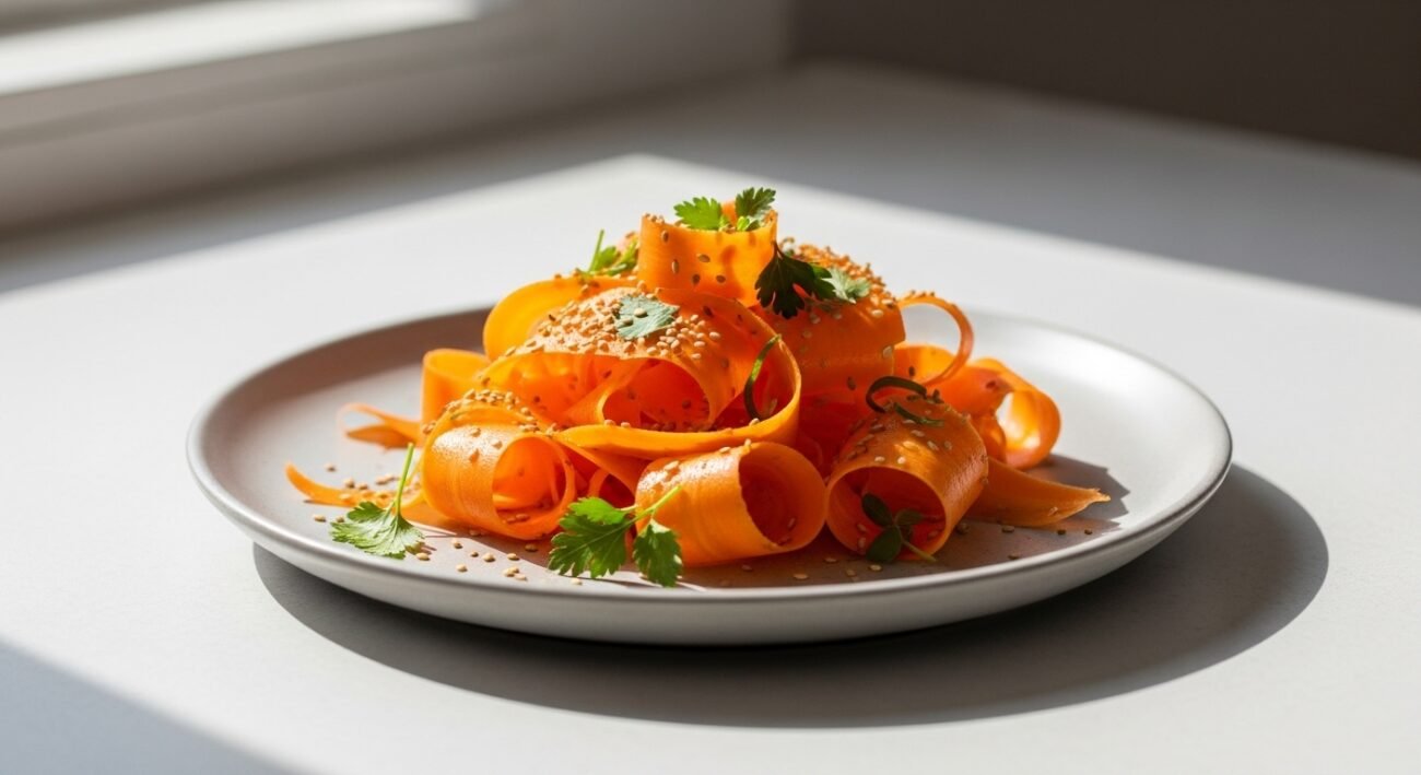 Peeling carrots into strips usually takes five to ten minutes. A quick blend of basic dressing does the rest – then just toss and finish. Use four to six whisked carrots mixed with sesame oil, rice vinegar, soy sauce, and lime juice. Add garlic or honey if desired, then top with sesame seeds and fresh herbs. Fresh works best, though short soaks in marinade do too.