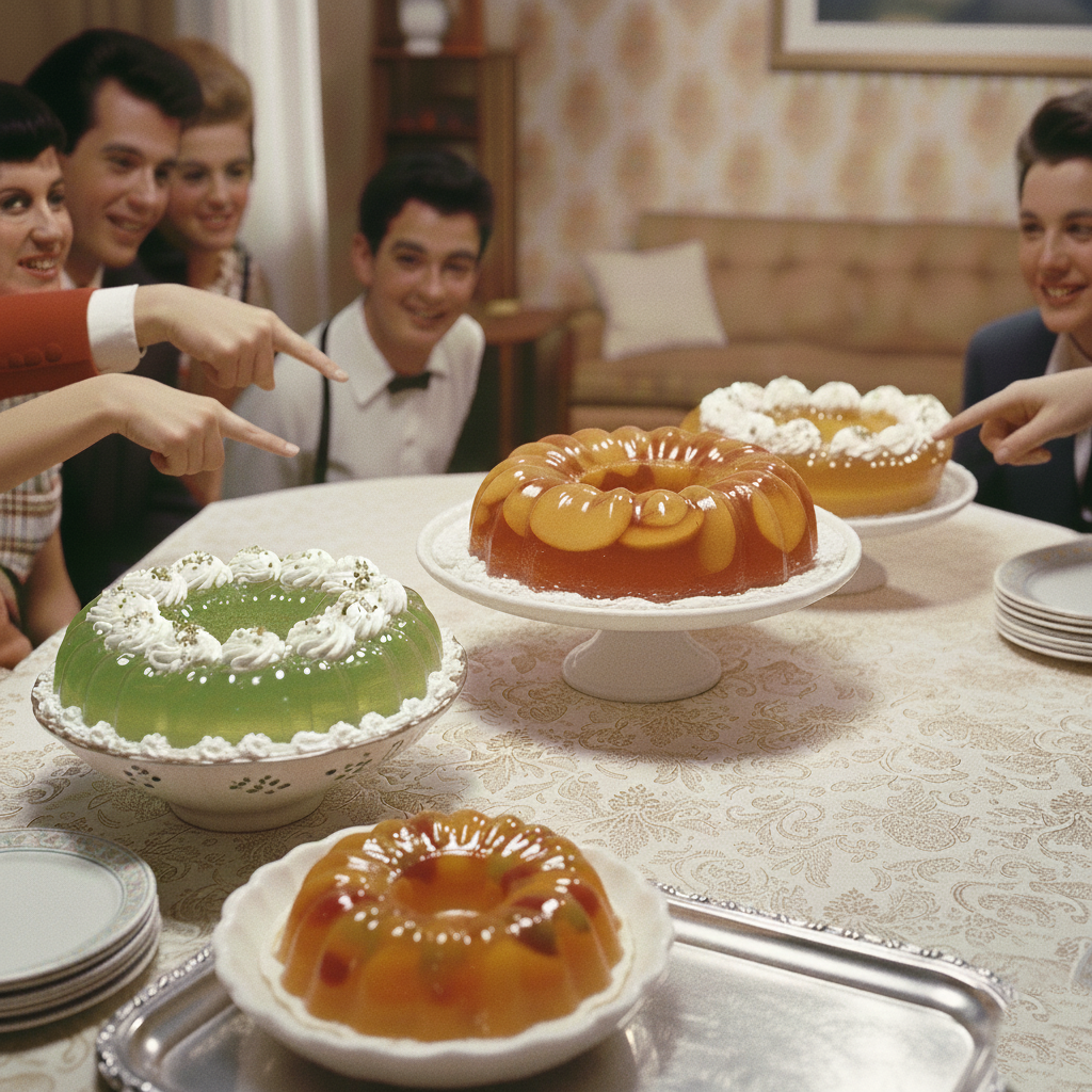 ruit or whipped topping gelatin dishes were often used at parties. They were viewed as stylish and entertaining back then.